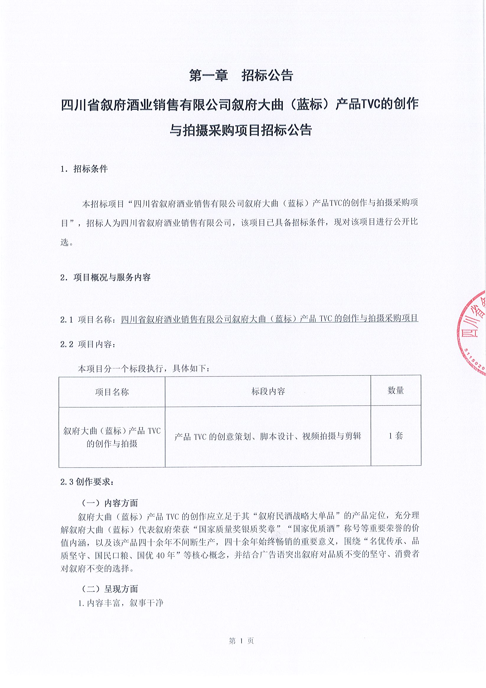四川省敘府酒業(yè)銷售有限公司敘府大曲(藍標)產品TVC的創(chuàng)作與拍攝采購項目招標公示公告
