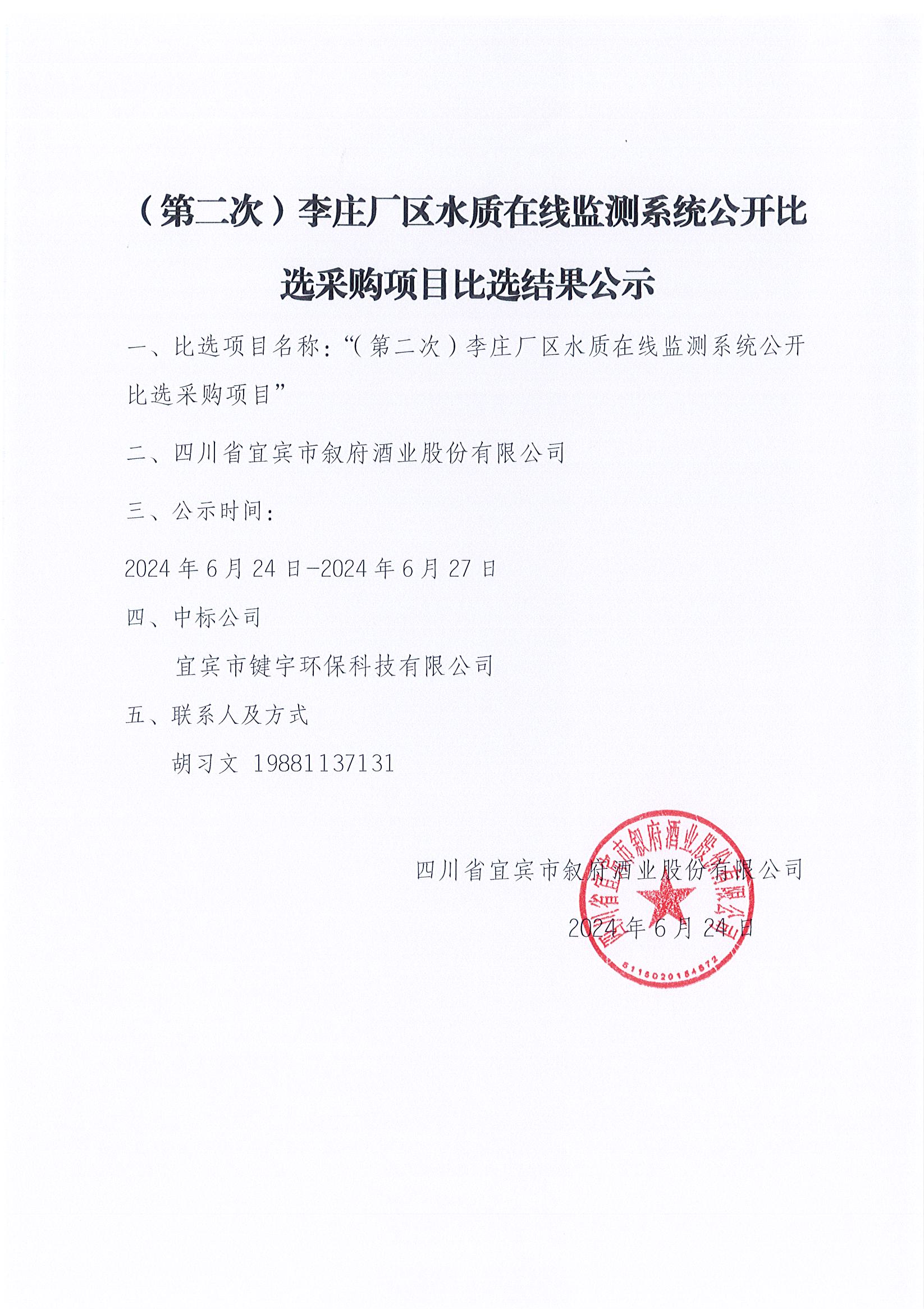 (第二次)李莊廠區(qū)水質在線監(jiān)測系統(tǒng)公開比選采購項目中標結果公示公告