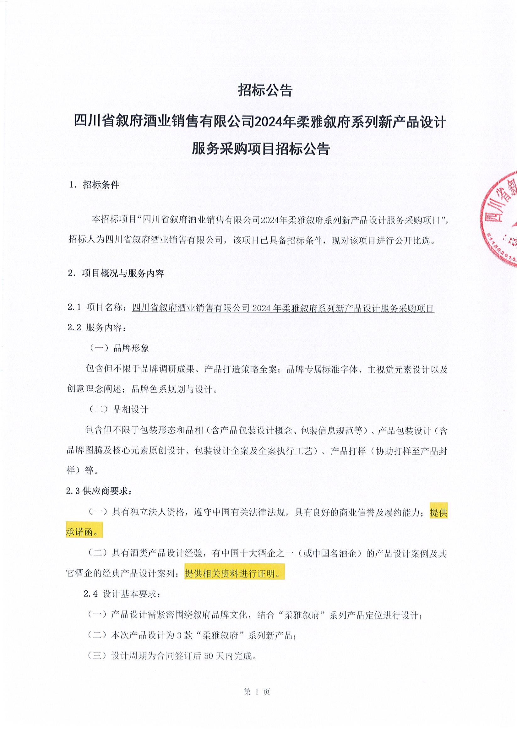 四川省敘府酒業(yè)銷售有限公司2024年柔雅敘府系列新產品設計服務采購項目招標公示公告