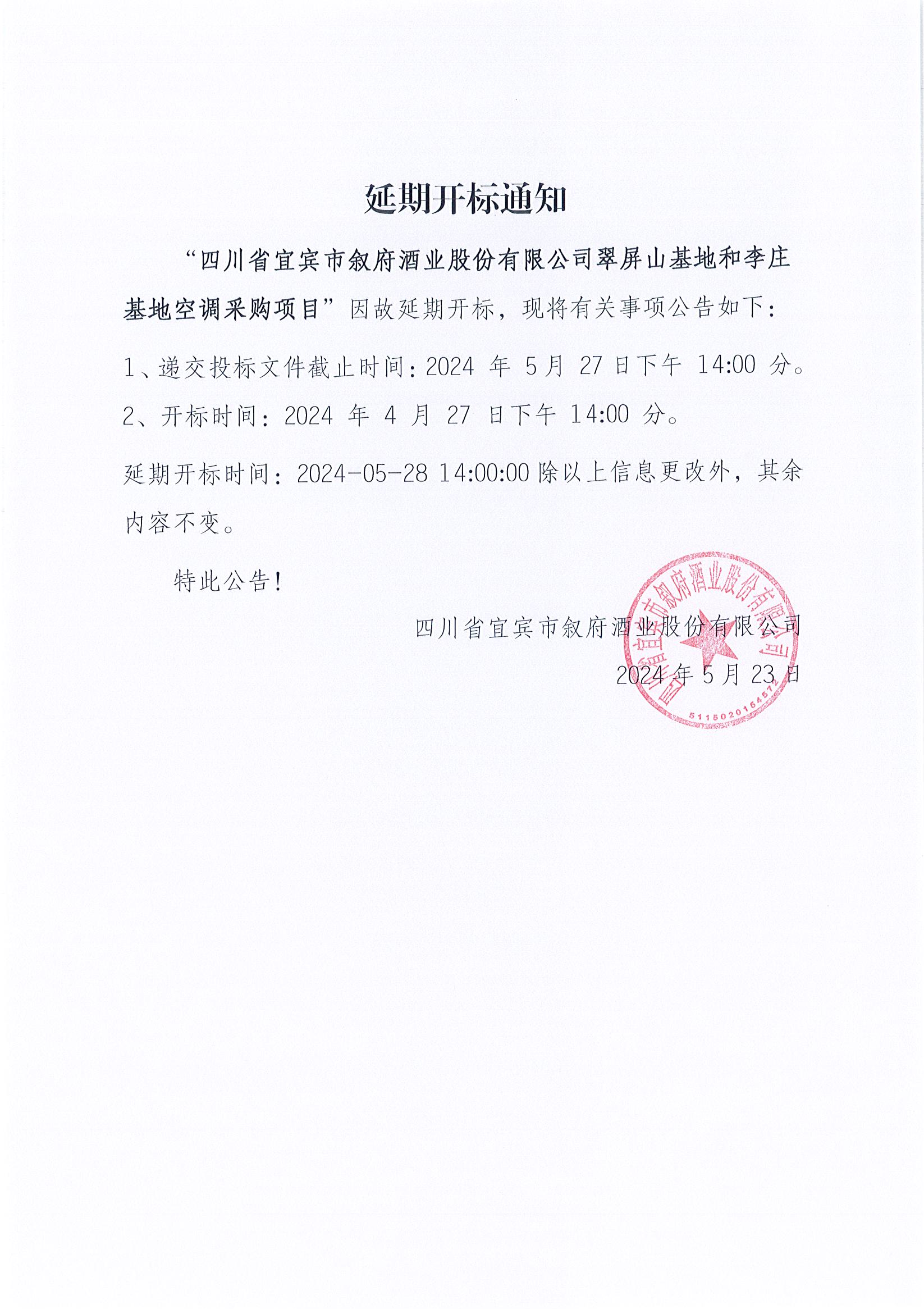 四川省宜賓市敘府酒業(yè)股份有限公司翠屏山基地和李莊基地空調采購項目延期開標通知