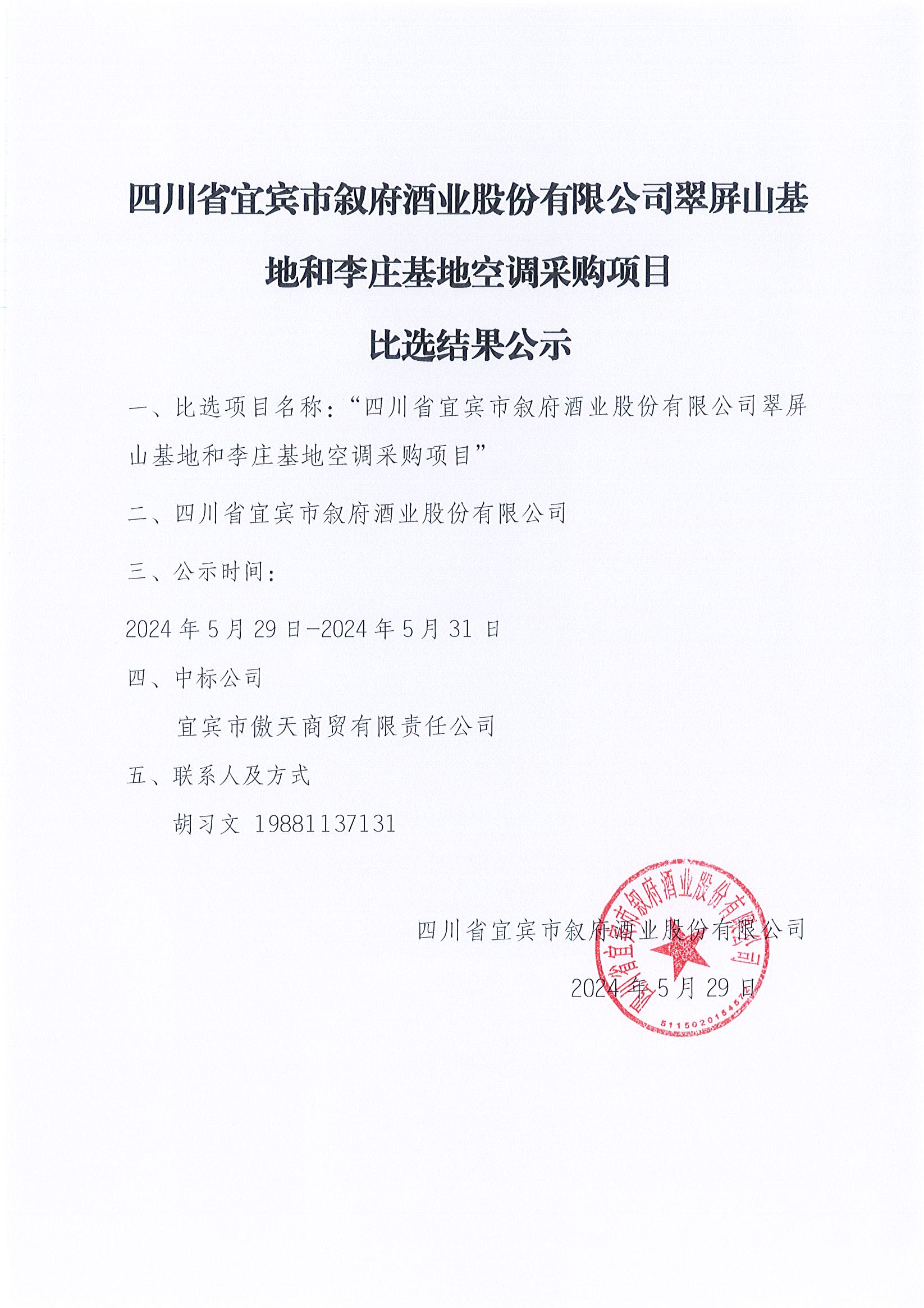 四川省宜賓市敘府酒業(yè)股份有限公司翠屏山基地和李莊基地空調采購項目比選結果公示