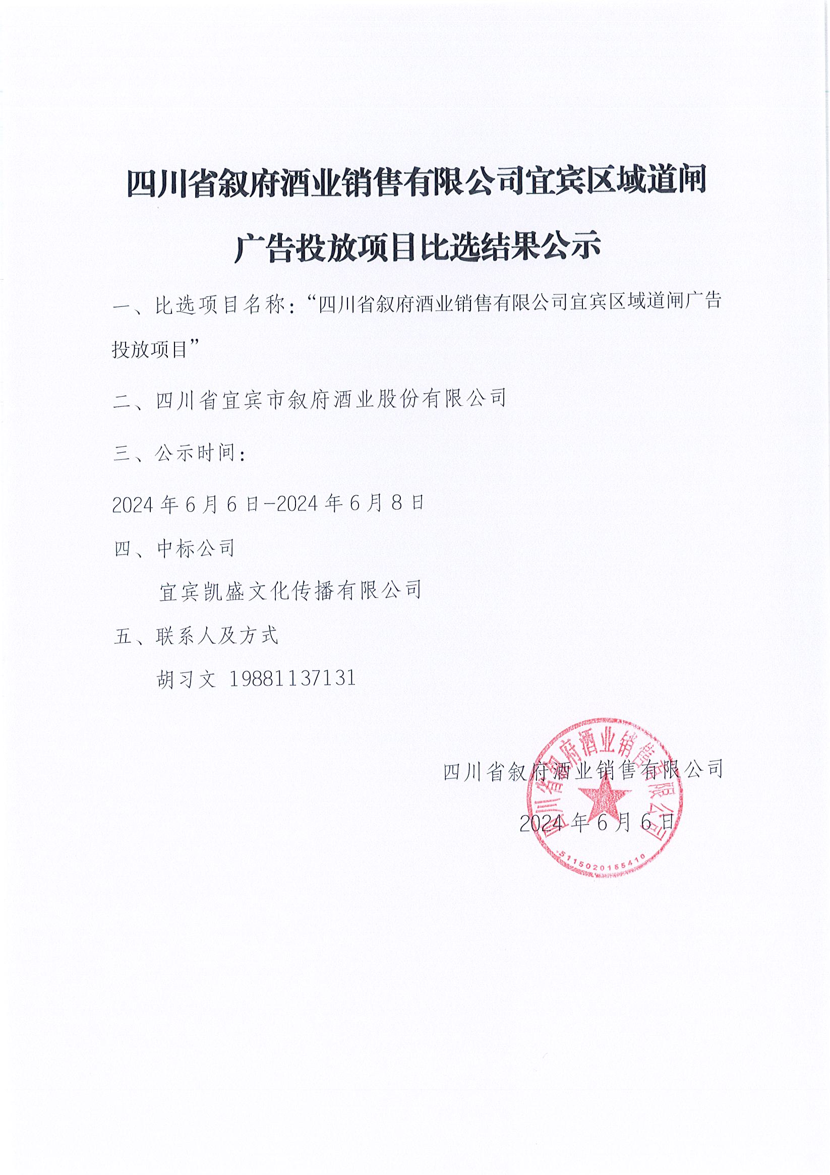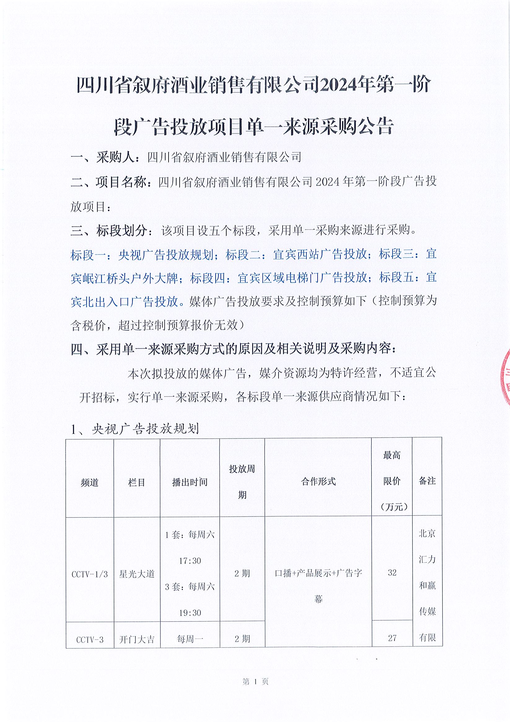 四川省敘府酒業(yè)銷售有限公司2024年第一階段廣告投放項目單一采購來源公示公告