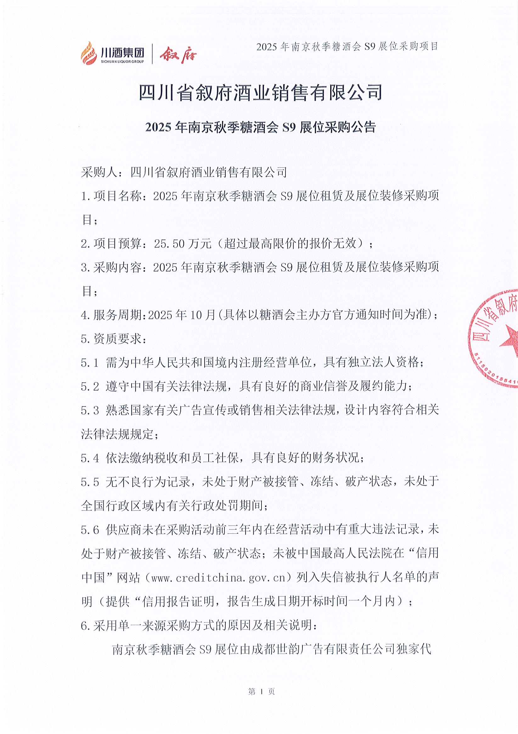 四川省敘府酒業(yè)銷(xiāo)售有限公司 2025年南京秋季糖酒會(huì)S9展位采購(gòu)公告單一來(lái)源采購(gòu)公告