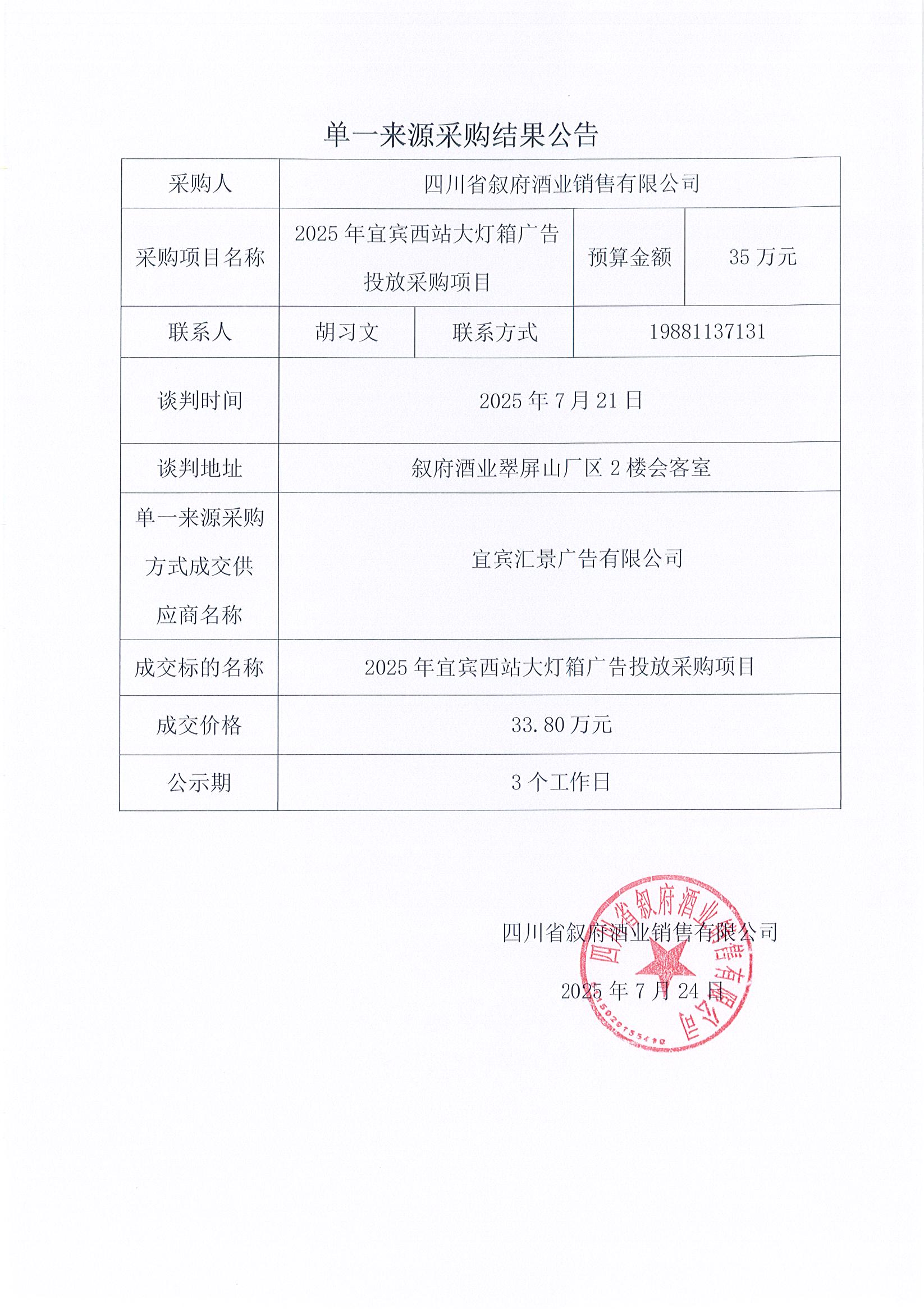 四川省敘府酒業(yè)銷(xiāo)售有限公司2025年宜賓西站大燈箱廣告投放采購(gòu)項(xiàng)目單一來(lái)源采購(gòu)結(jié)果公示公告