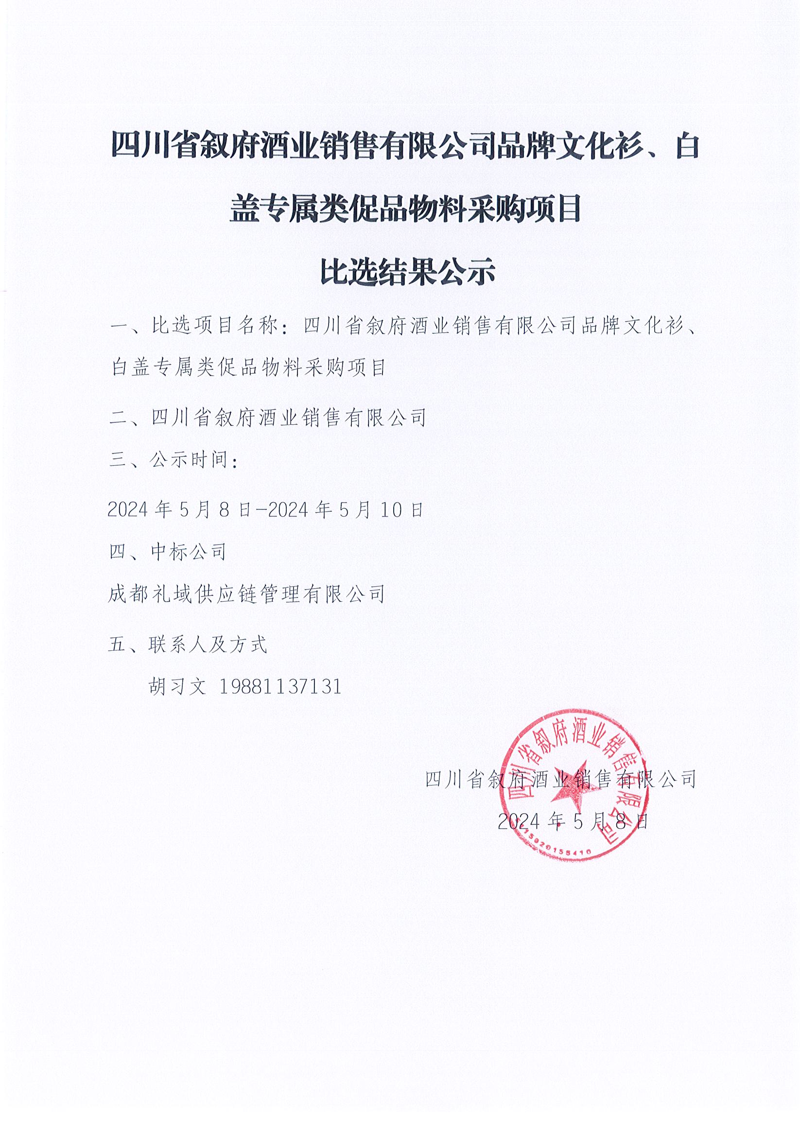 四川省敘府酒業(yè)銷售有限公司品牌文化衫、白蓋專屬類促品物料采購項(xiàng)目比選公告