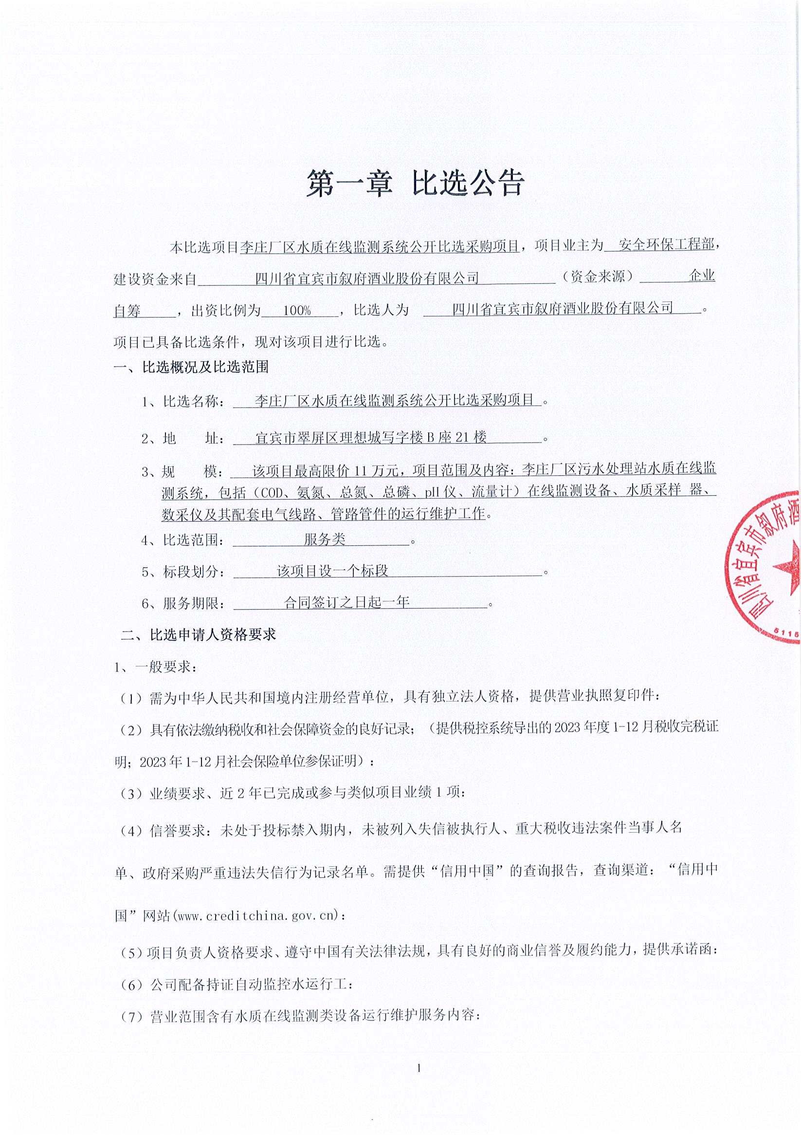 四川省宜賓市敘府酒業(yè)股份有限公司李莊廠區(qū)水質(zhì)在線監(jiān)測系統(tǒng)公開比選采購項目流標(biāo)公示公告