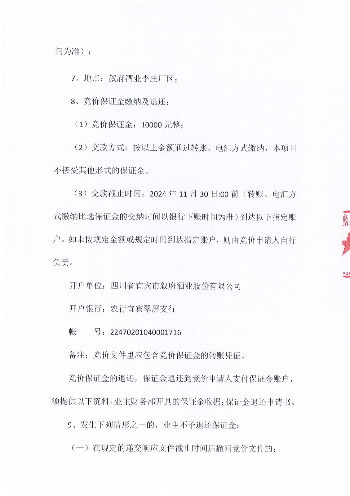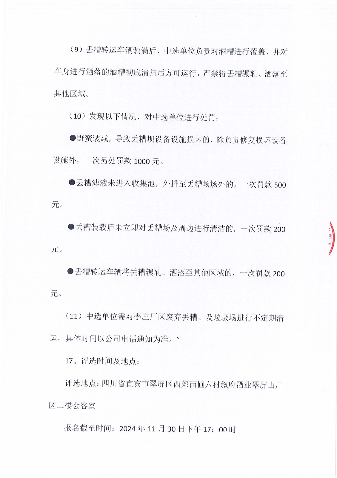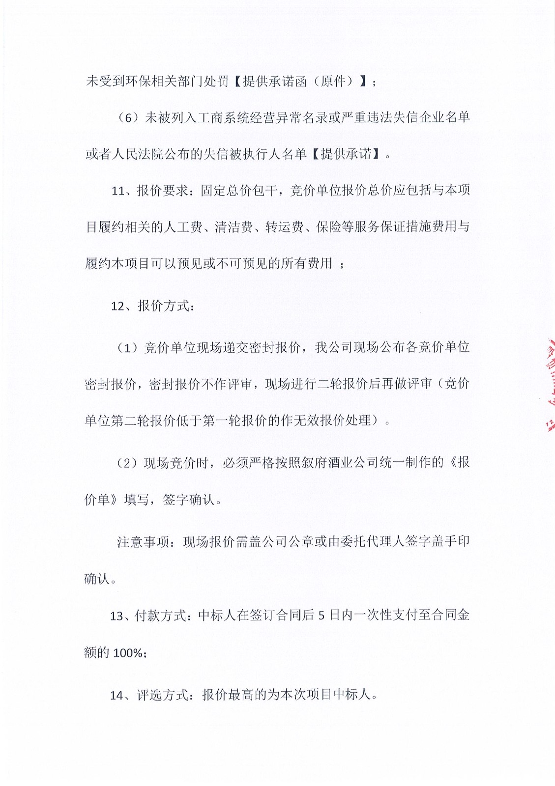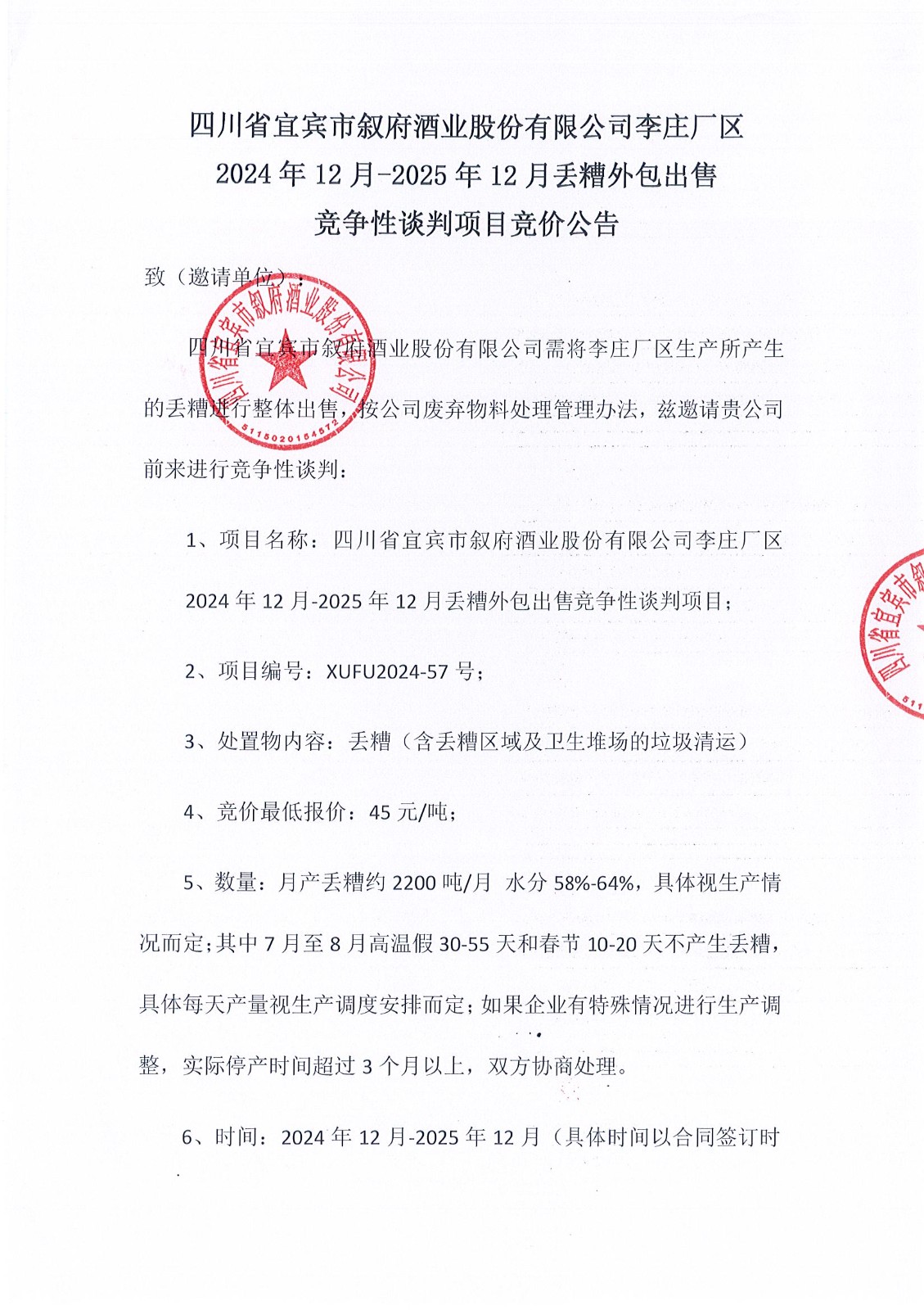 (第二次)四川省宜賓市敘府酒業(yè)股份有限公司李莊廠區(qū)2024年12月-2025年12月丟糟外包處置 項目競價公告