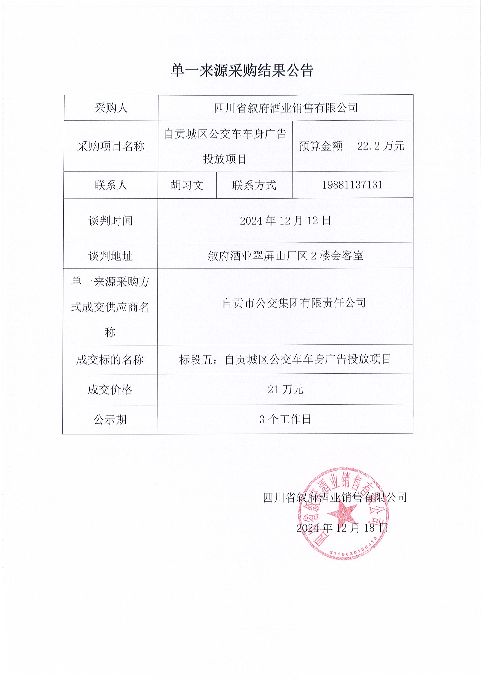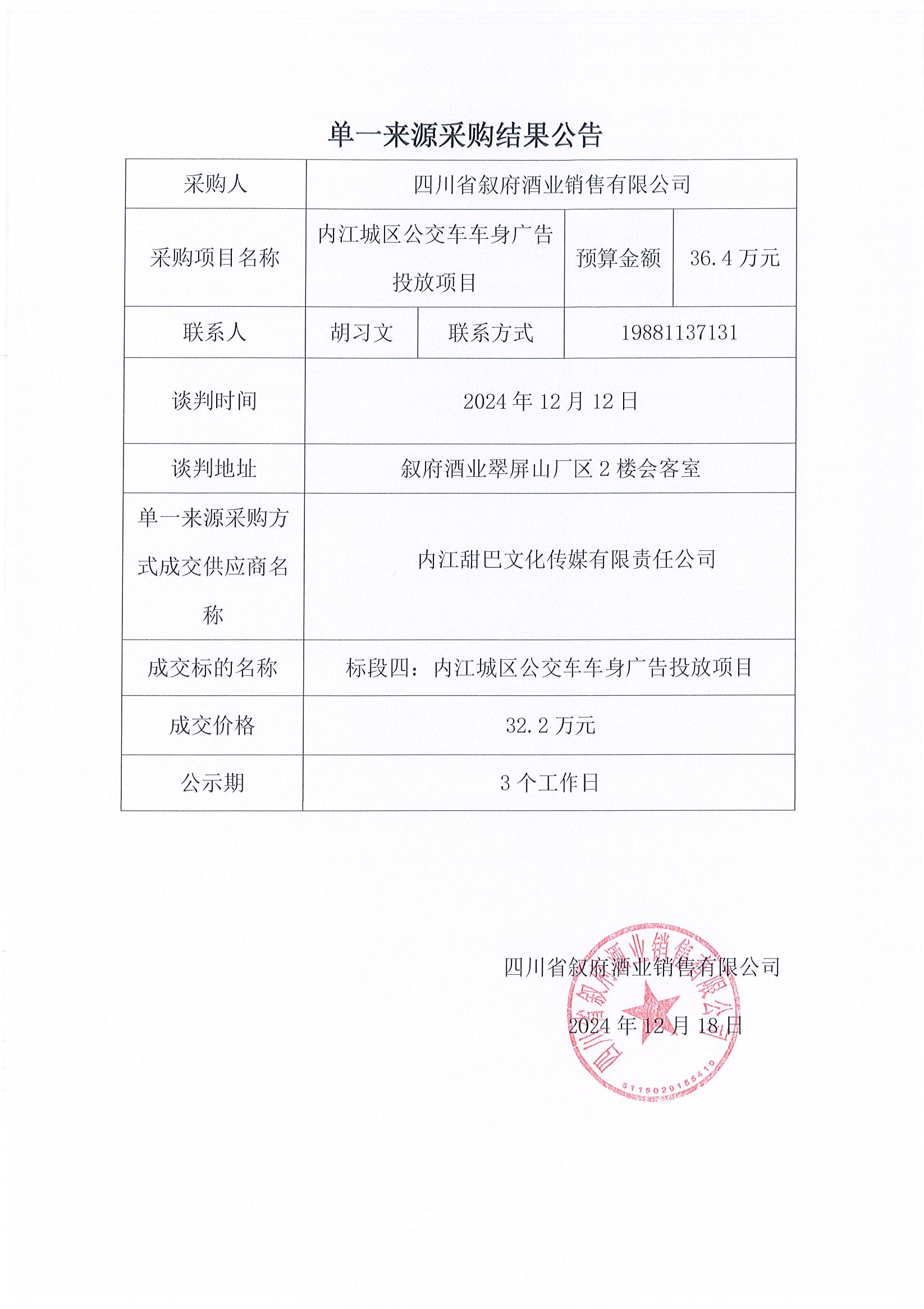 四川省敘府酒業(yè)銷售有限公司敘府大曲(藍(lán)標(biāo))產(chǎn)品TVC的創(chuàng)作與拍攝采購項(xiàng)目中標(biāo)結(jié)果公示公告