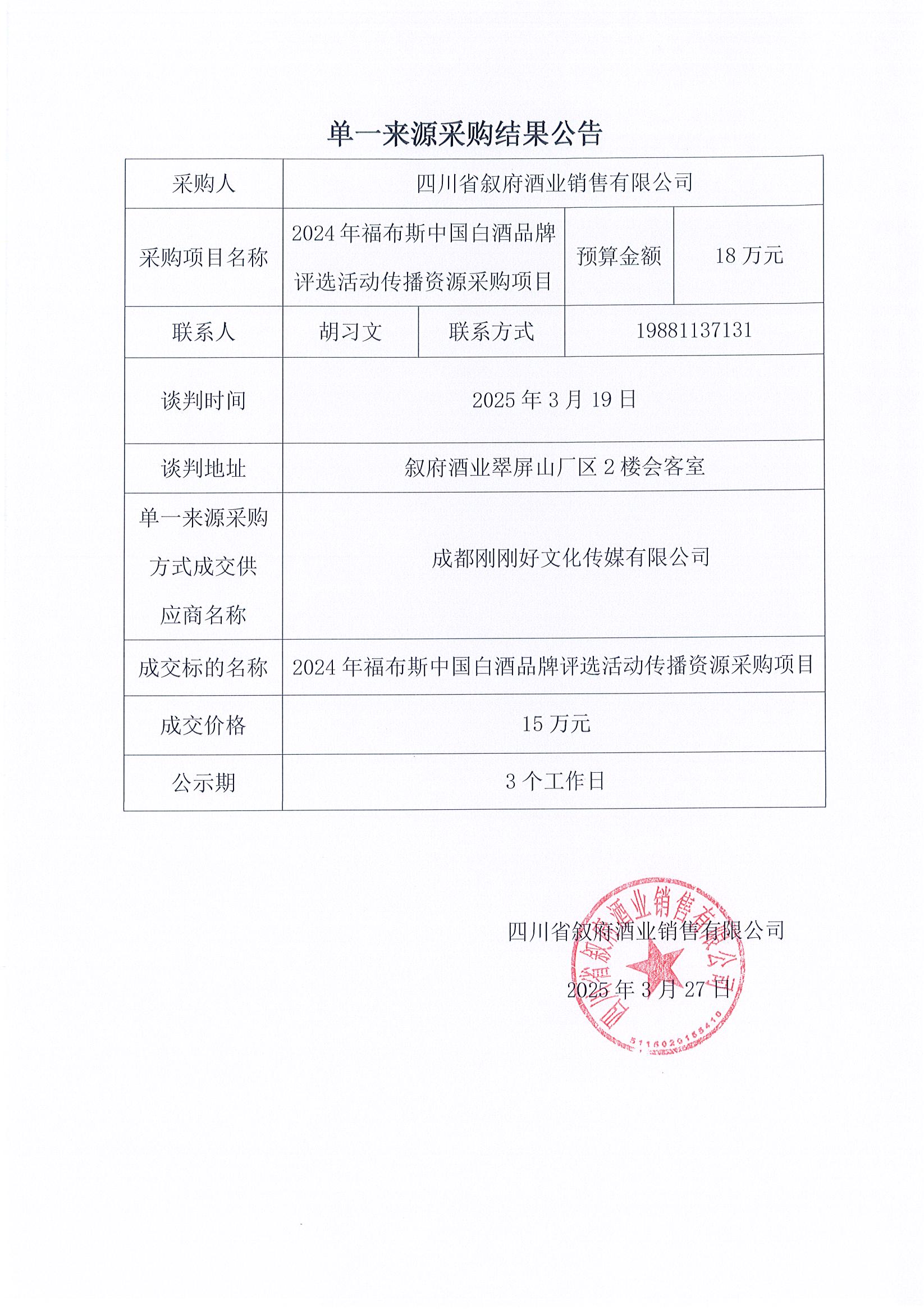 四川省敘府酒業(yè)銷售有限公司敘府大曲(藍(lán)標(biāo))產(chǎn)品TVC的創(chuàng)作與拍攝采購(gòu)項(xiàng)目中標(biāo)結(jié)果公示公告