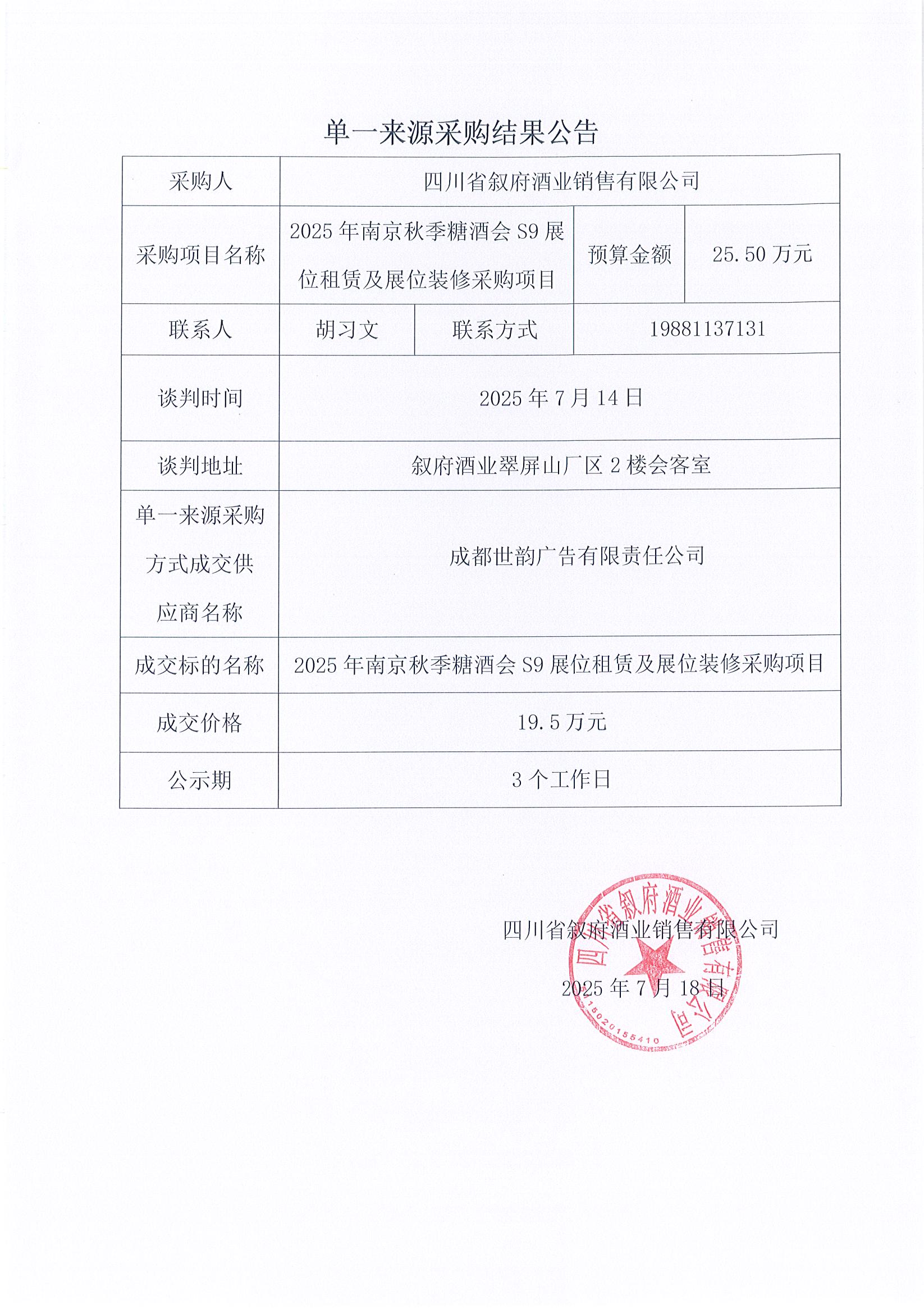 四川省敘府酒業(yè)銷售有限公司2025年宜賓西站大燈箱廣告投放采購項(xiàng)目單一來源采購結(jié)果公示公告
