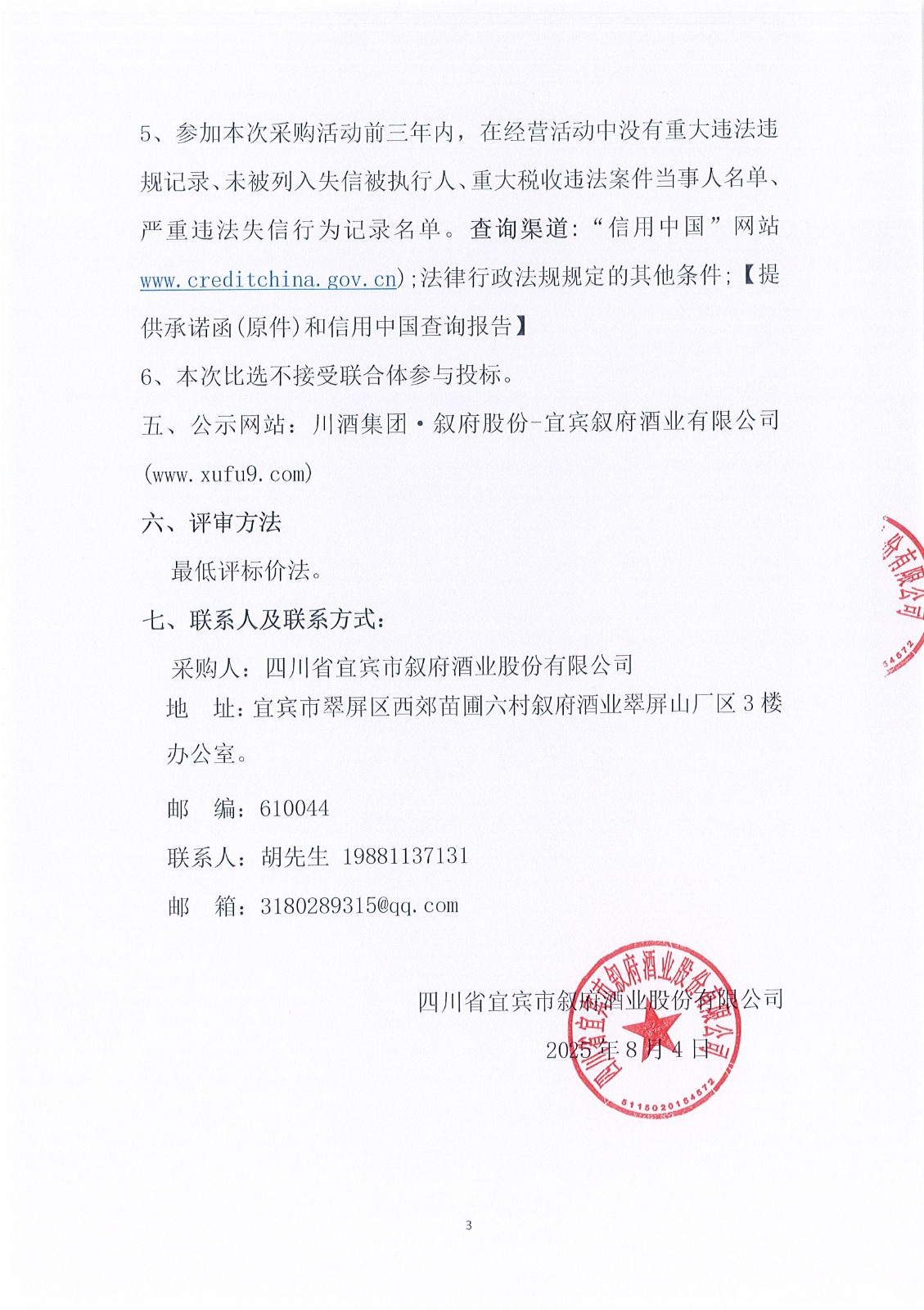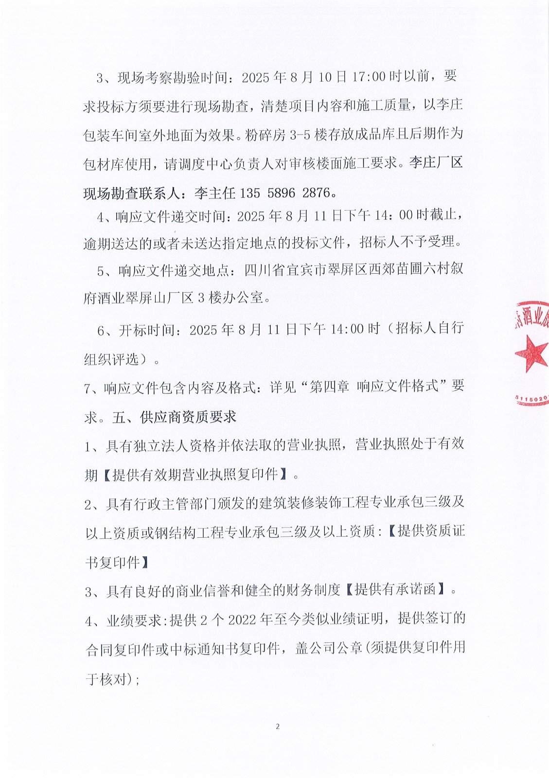 四川省宜賓市敘府酒業(yè)股份有限公司2025年熱季檢修項目公開比選招標公告