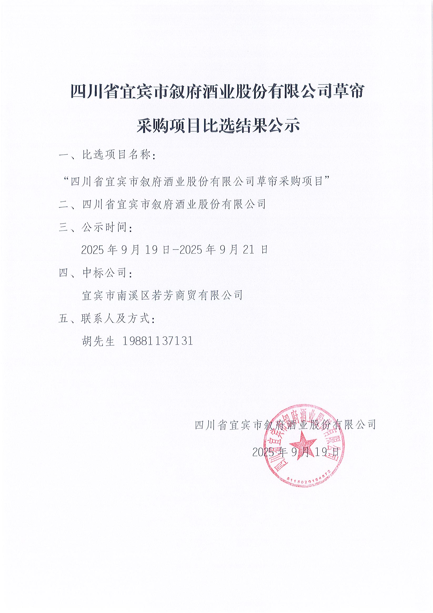 四川省宜賓市敘府酒業(yè)股份有限公司草簾采購項目比選結(jié)果公示