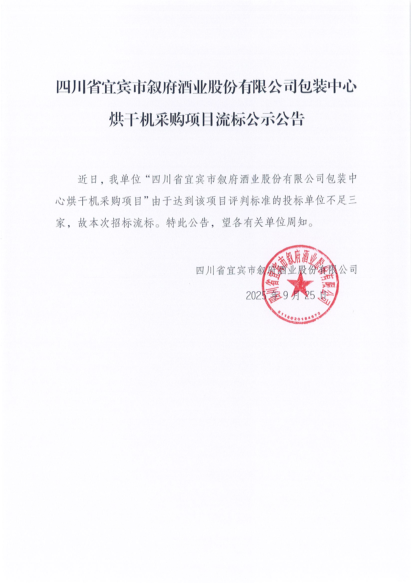 四川省宜賓市敘府酒業(yè)股份有限公司包裝中心烘干機采購項目流標公示公告