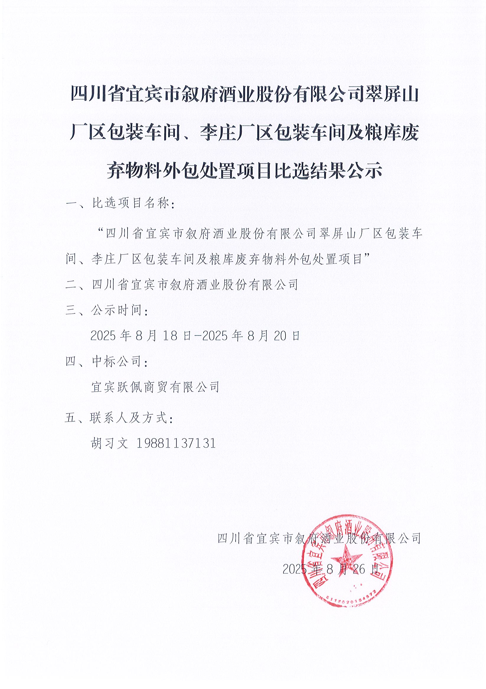 第二次四川省宜賓市敘府酒業(yè)股份有限公司熱季檢修李莊自動(dòng)化量水設(shè)備制公告安采購(gòu)項(xiàng)目比選結(jié)果公示