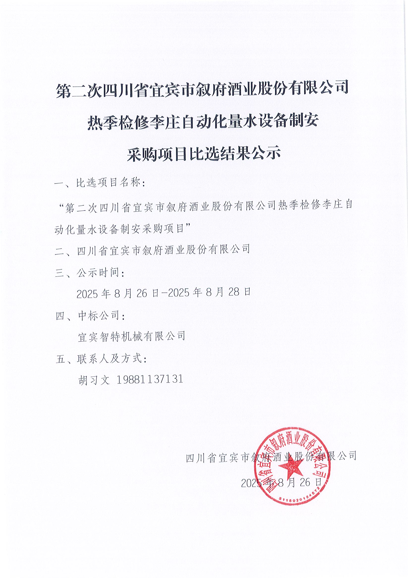 四川省宜賓市敘府酒業(yè)股份有限公司翠屏山廠區(qū)包裝車間、李莊廠區(qū)包裝車間及糧庫廢棄物料外包處置項目比選結果公示公告