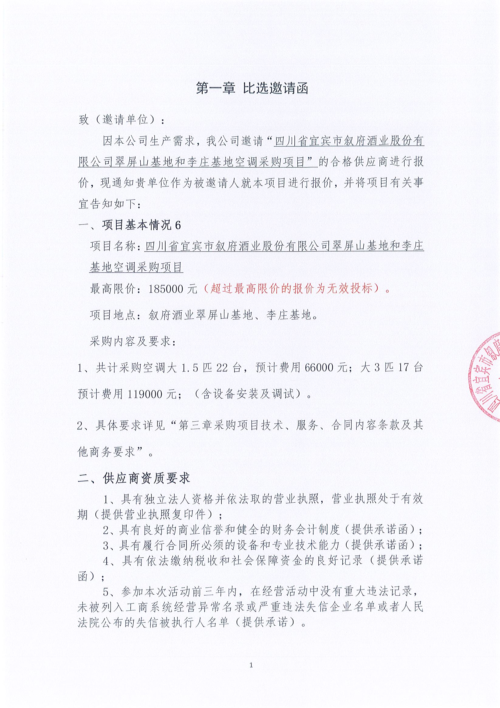 四川省宜賓市敘府酒業(yè)股份有限公司翠屏山基地和李莊基地空調采購項目公開比選公告