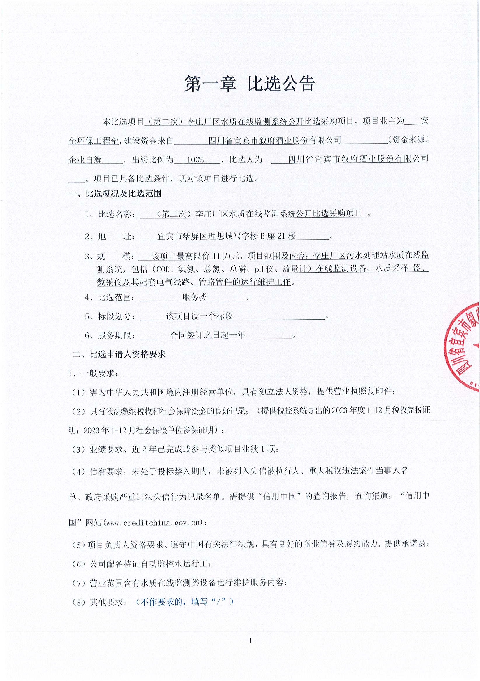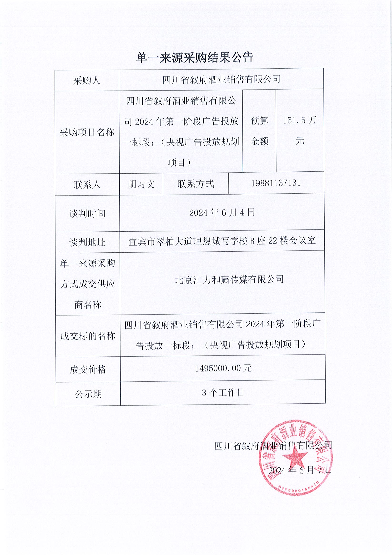 四川省敘府酒業(yè)銷售有限公司2024年第一階段廣告投放項目單一采購來源公示公告