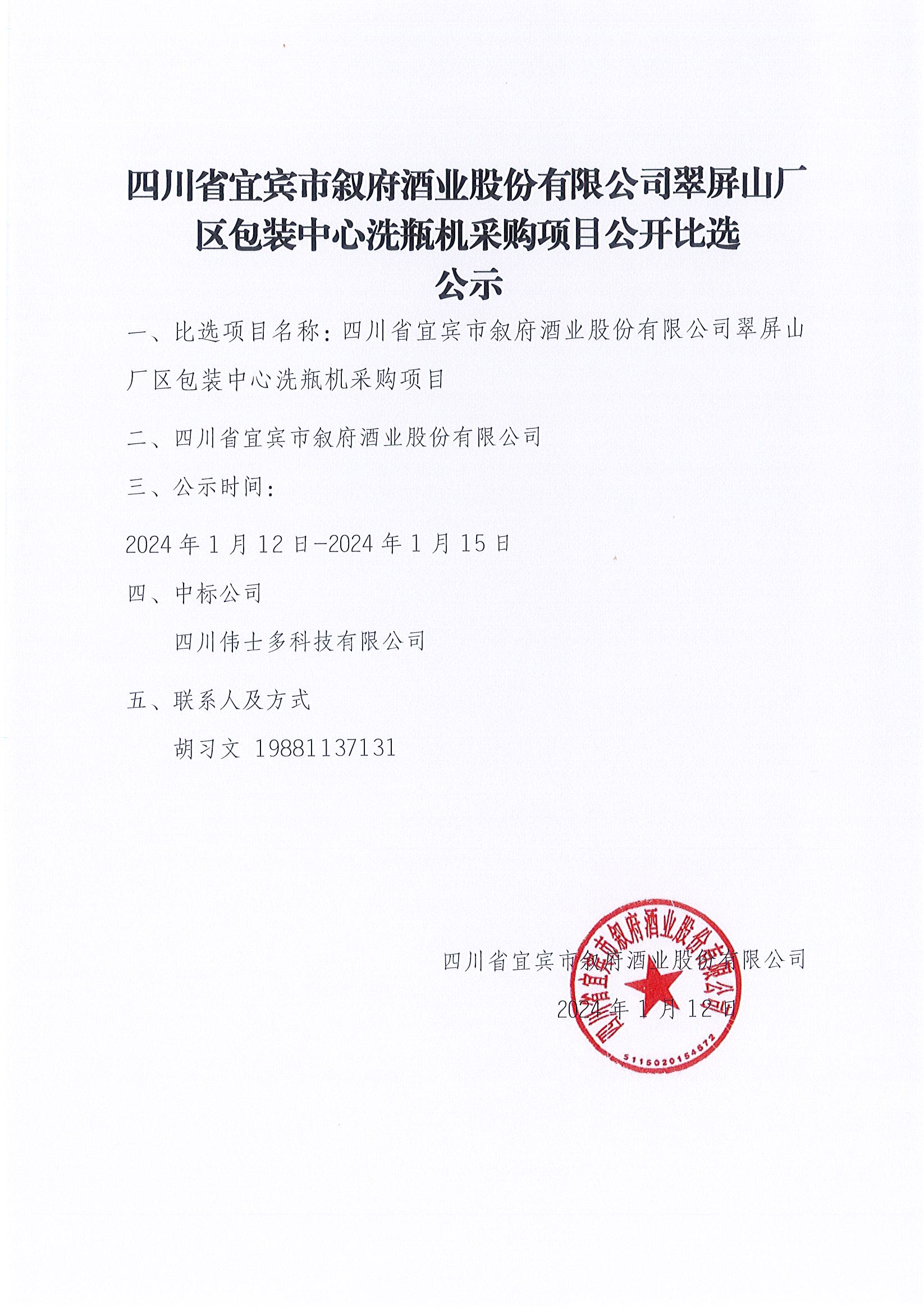 四川省宜賓市敘府酒業(yè)股份有限公司 2024年春季糖酒會(成都泰合國際大飯店)場地租賃中標(biāo)結(jié)果公示公告