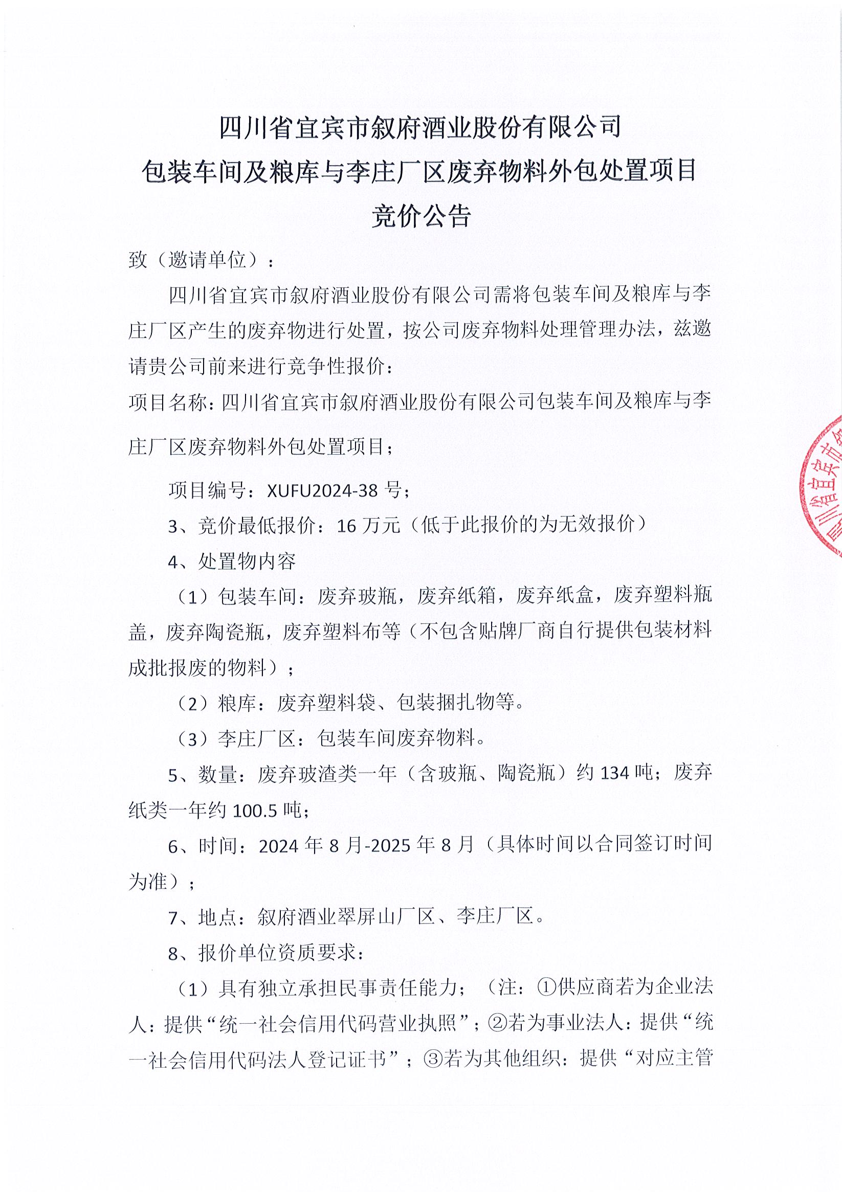 四川省宜賓市敘府酒業(yè)股份有限公司 包裝車間及糧庫與李莊廠區(qū)廢棄物料外包處置項目 競價公告