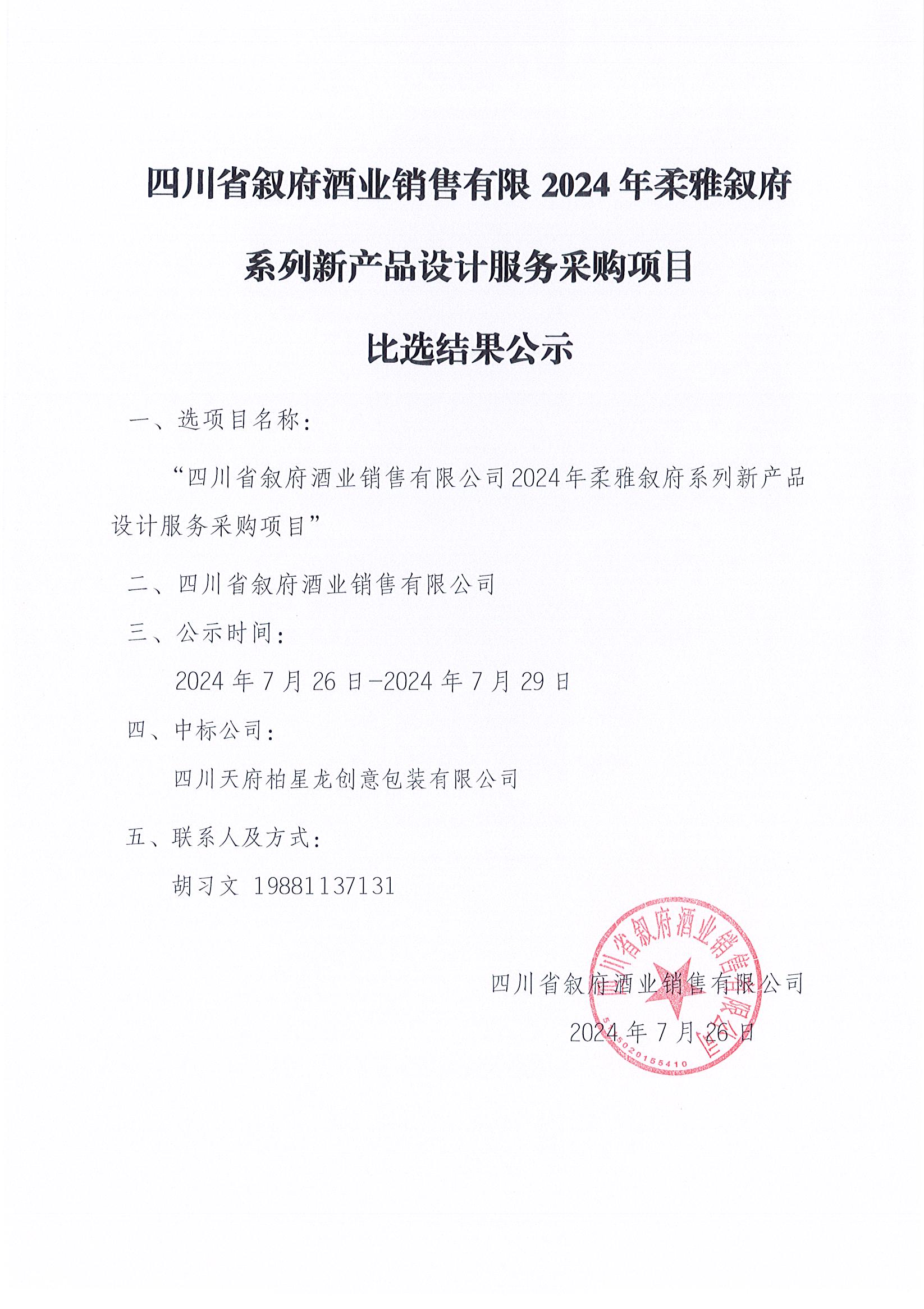四川省敘府酒業(yè)銷售有限公司 2024年柔雅敘府系列新產(chǎn)品設計服務采購項目比選結(jié)果公示公告