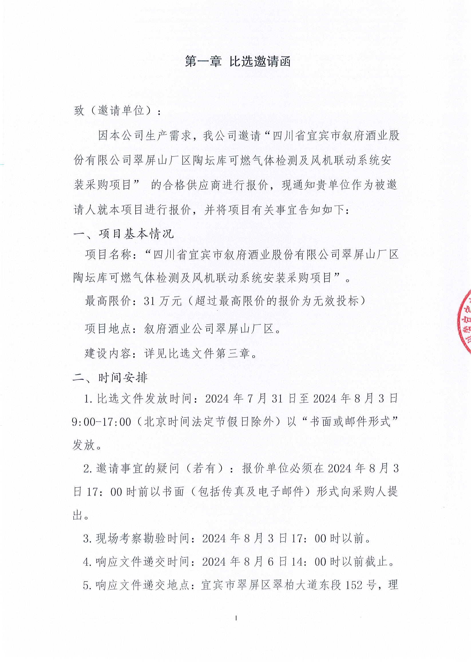 四川省宜賓市敘府酒業(yè)股份有限公司翠屏山廠區(qū)陶壇庫可燃氣體檢測及風機聯(lián)動系統(tǒng)安裝采購項目公開比選公示公告
