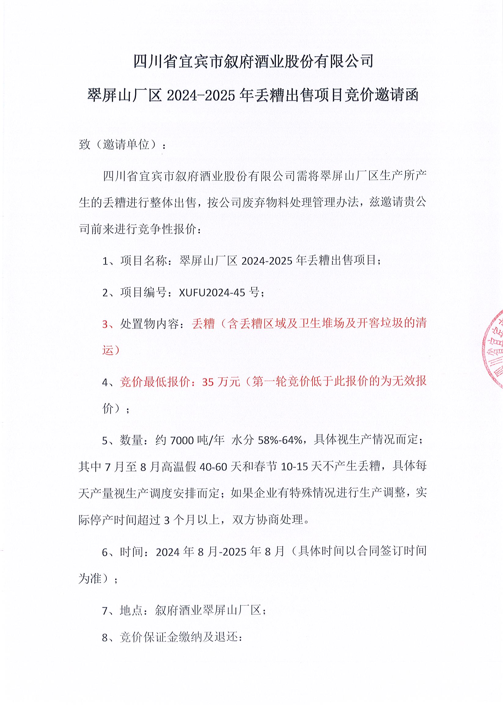 四川省宜賓市敘府酒業(yè)股份有限公司 翠屏山廠區(qū)2024-2025年丟糟出售項目競價邀請函公示公告