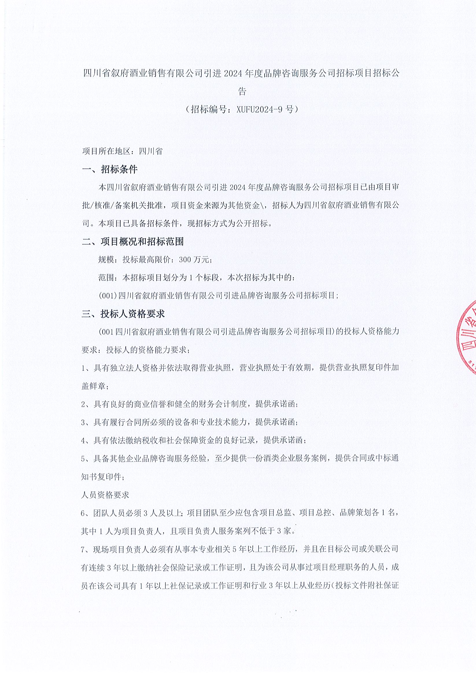 四川省敘府酒業(yè)銷售有限公司 引進2024年度品牌咨詢服務公司 招標項目公告