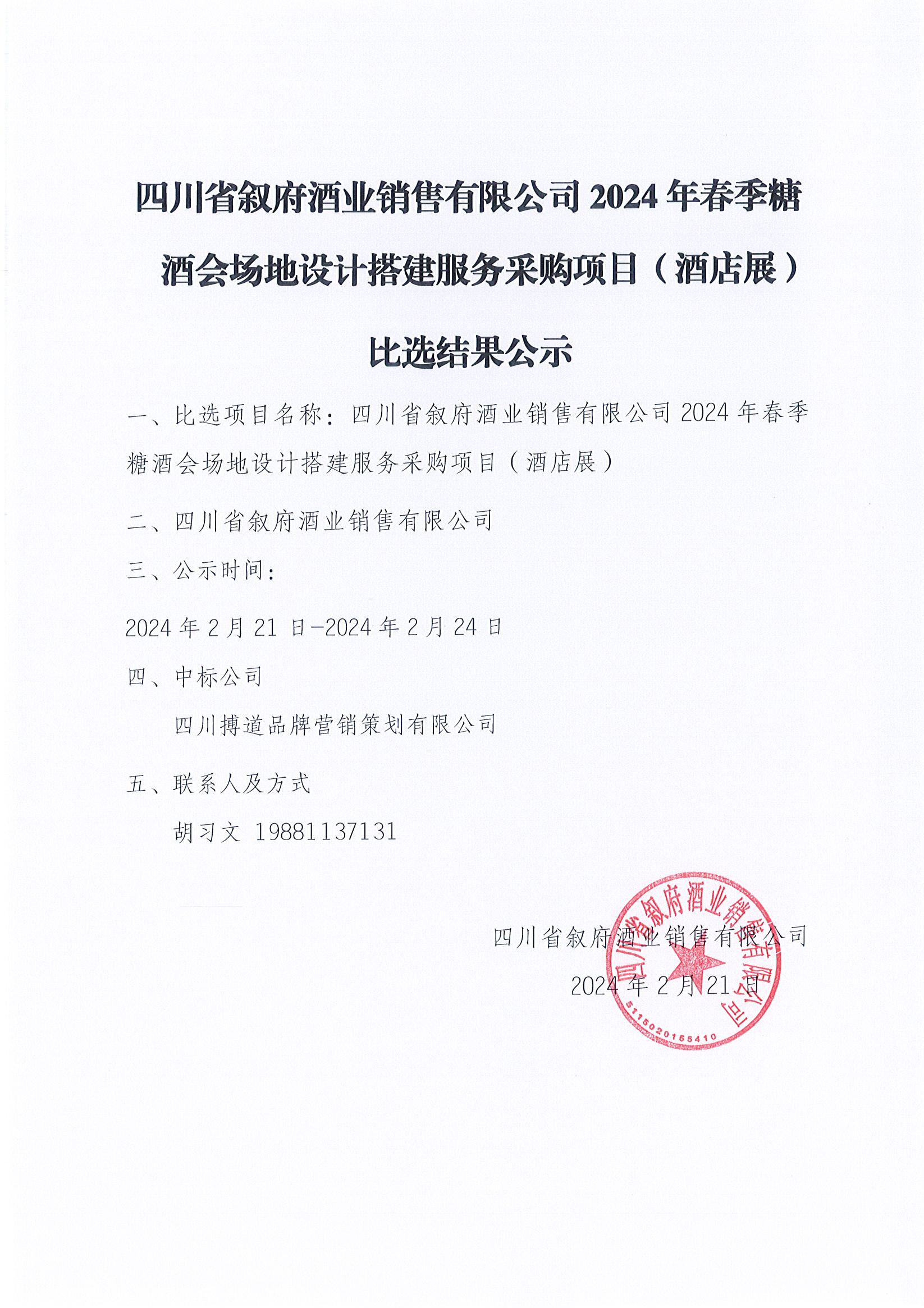 四川省敘府酒業(yè)銷售有限公司2024年春季糖酒會廣告投放項目 單一來源采購結果公示公告