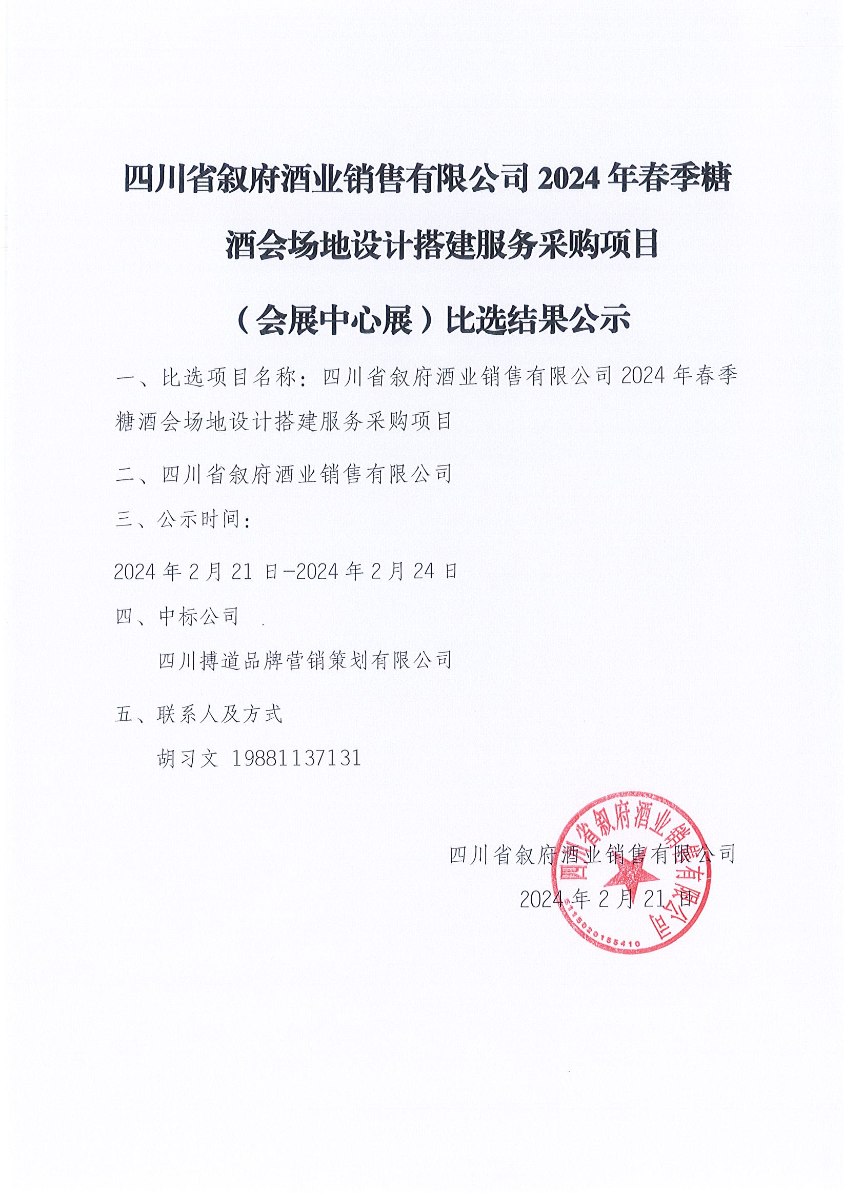 四川省敘府酒業(yè)銷售有限公司2024年春季糖酒會場地設計搭建服務采購項目(會展中心)搭建中標結果公示公告