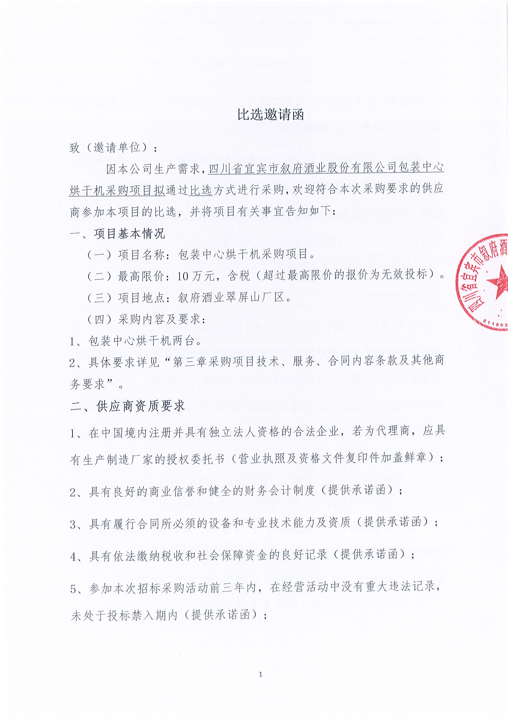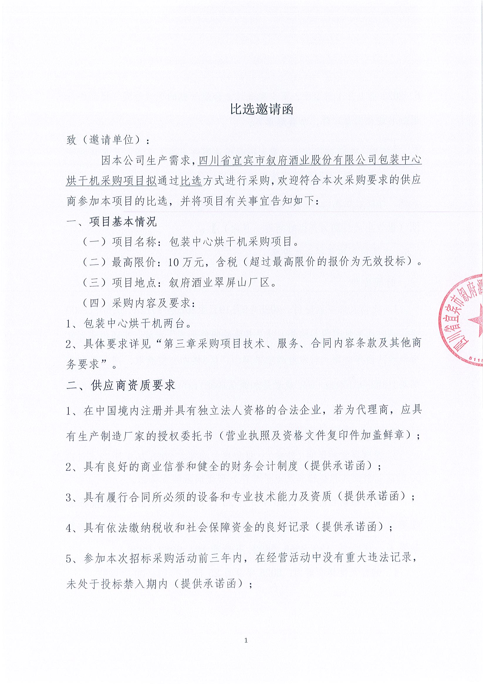(第二次)四川省宜賓市敘府酒業(yè)股份有限公司包裝中心烘干機采購項目比選招標公告