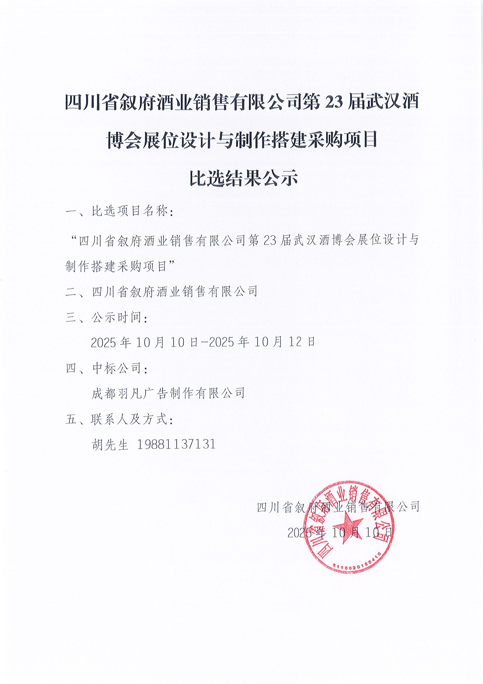 四川省敘府酒業(yè)銷售有限公司第23屆武漢酒博會展位設(shè)計與制作搭建采購項目比選結(jié)果公示公告