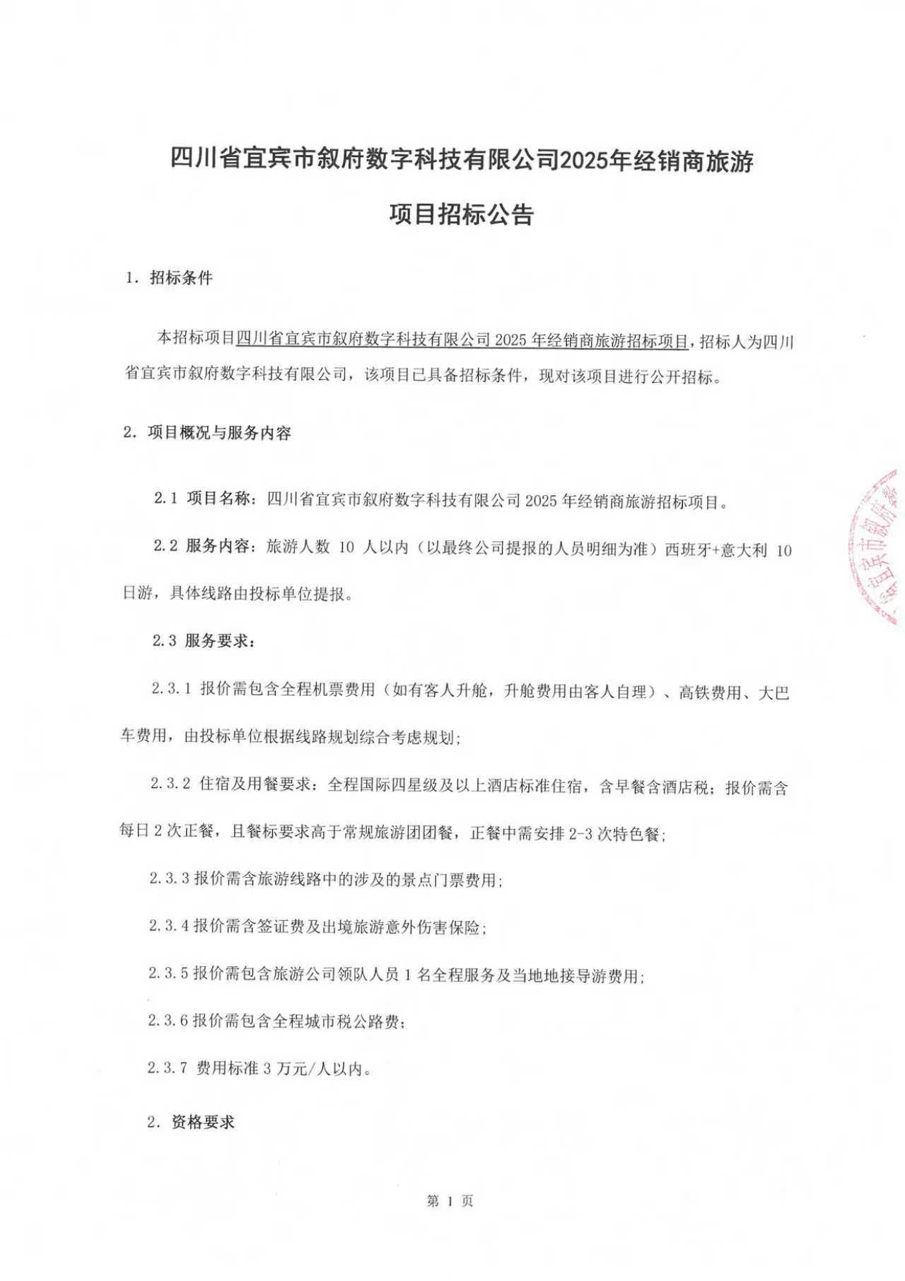 四川省宜賓市敘府數(shù)字科技有限公司2025年經(jīng)銷商旅游招標項目招標公告