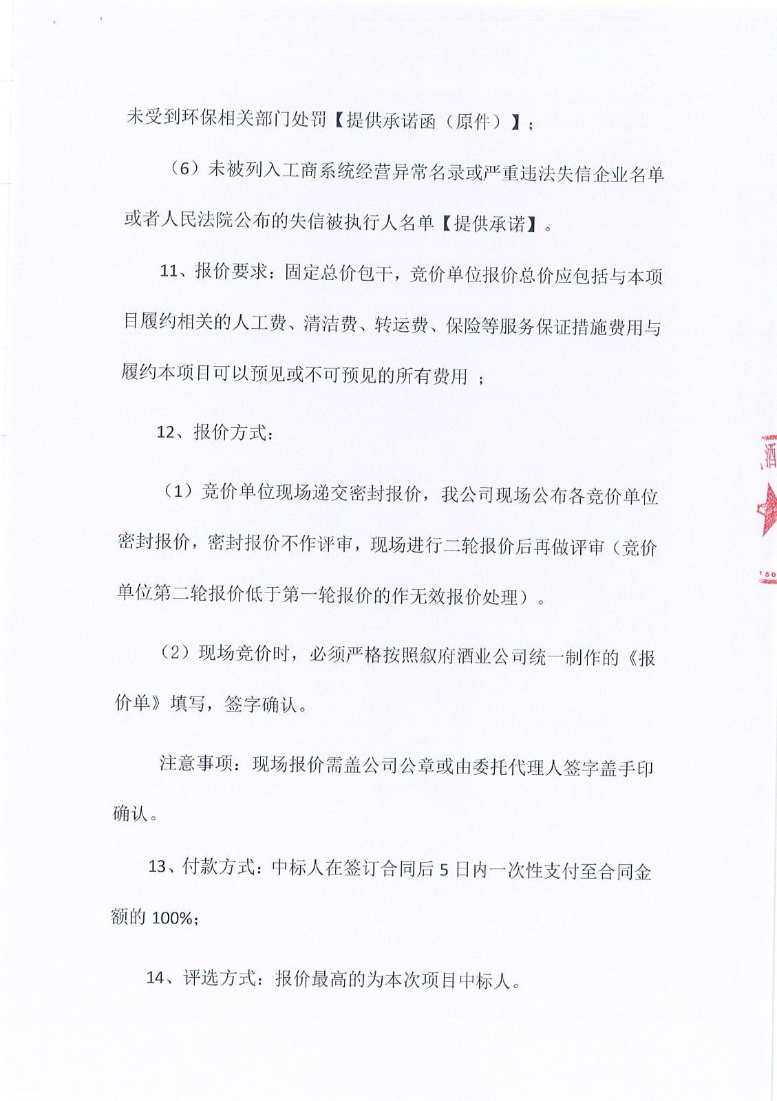 (第二次)四川省宜賓市敘府酒業(yè)股份有限公司李莊廠區(qū)2024年12月-2025年12月丟糟外包處置 項目競價公告