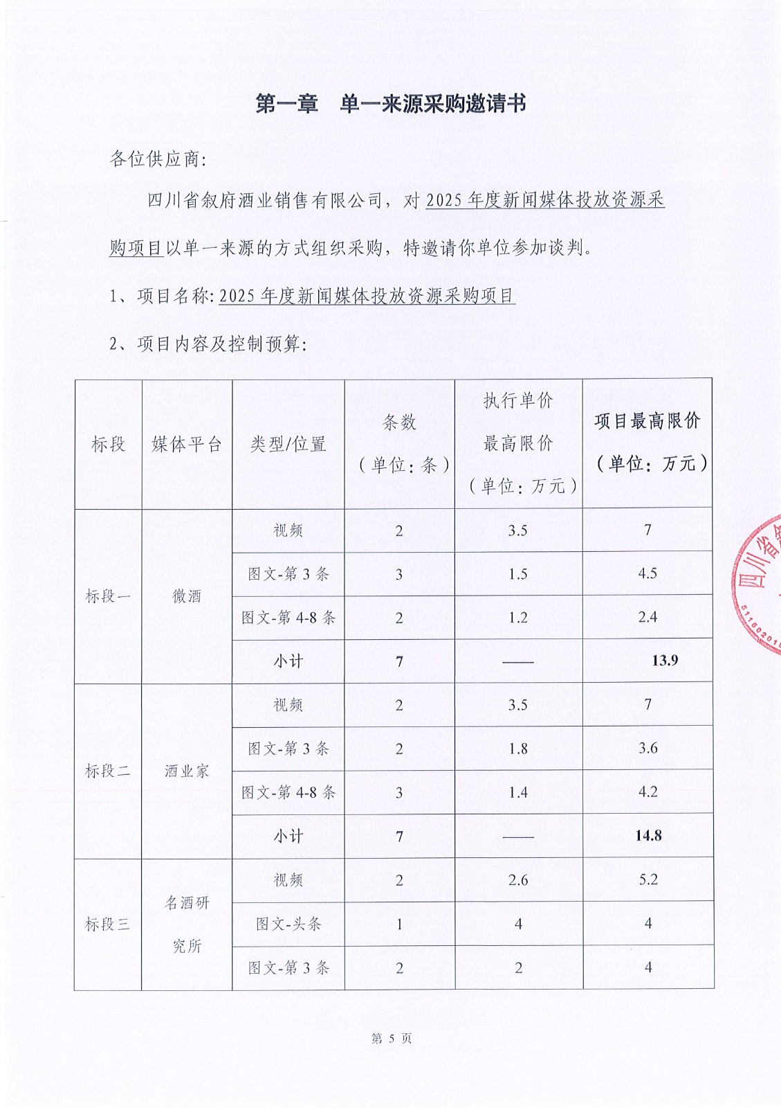 四川省敘府酒業(yè)銷售有限公司2025年度新聞媒體投放資源采購項目單一來源采購邀請書