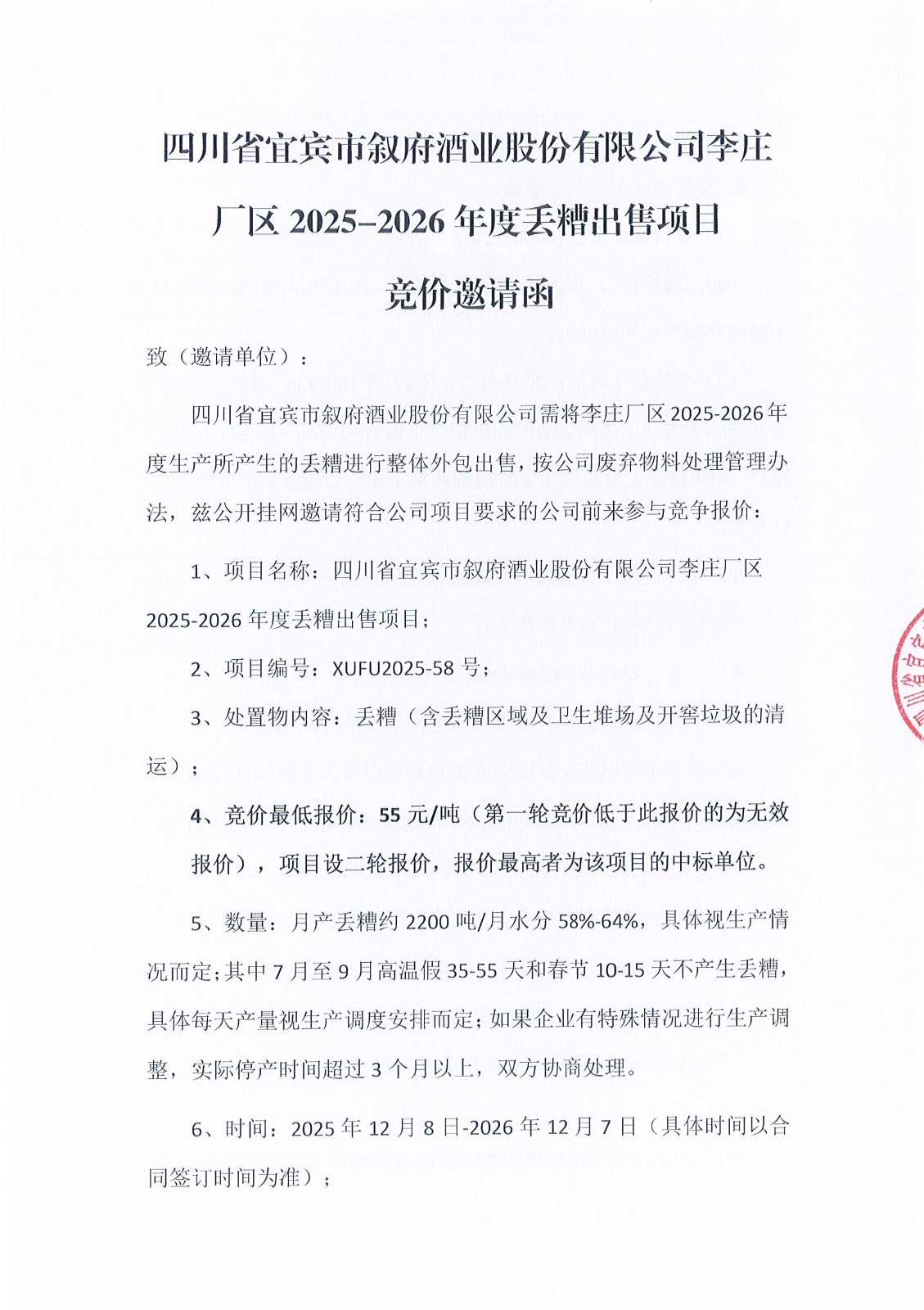 四川省宜賓市敘府酒業(yè)股份有限公司李莊廠區(qū)2025-2026年度丟糟出售項(xiàng)目競(jìng)價(jià)結(jié)果公示公告